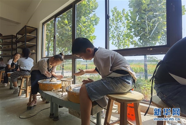 安徽省长丰县杨庙镇马郢社区的孩子在村里建设的陶艺体验馆内学习陶艺(手机照片,8月24日摄)。 新华社记者 朱青 摄