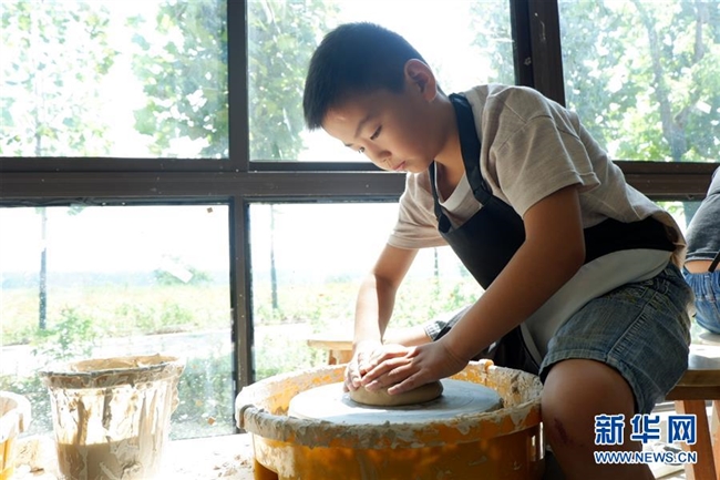 安徽省长丰县杨庙镇马郢社区的孩子在村里建设的陶艺体验馆内学习陶艺(8月24日摄)。 新华社记者 杭泽波 摄