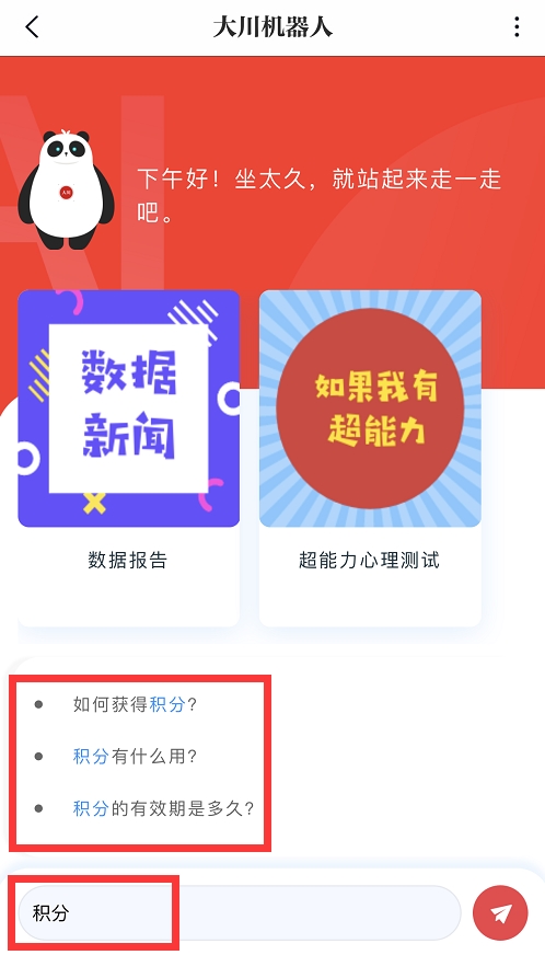 以上所有关于川观新闻客户端积分商城的问题,均可在客户端首屏,找到四川日报全媒体最新入职的AI机器人同事“大川”,获取答案。向“大川”提问:输入关键字“积分”,就可收到相关提问及回复。