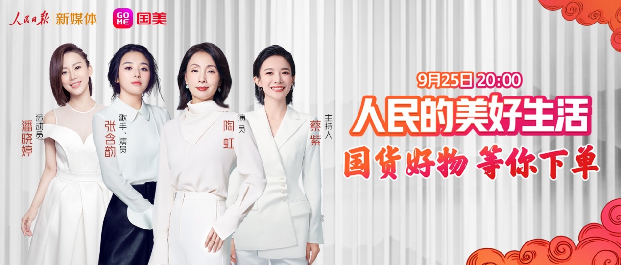 9月25日晚,人民日报新媒体联合国美推出直播带货专场,邀请演员陶虹、歌手张含韵、运动员潘晓婷及主持人蔡紫来到人民日报直播间,一同为美好生活助力。