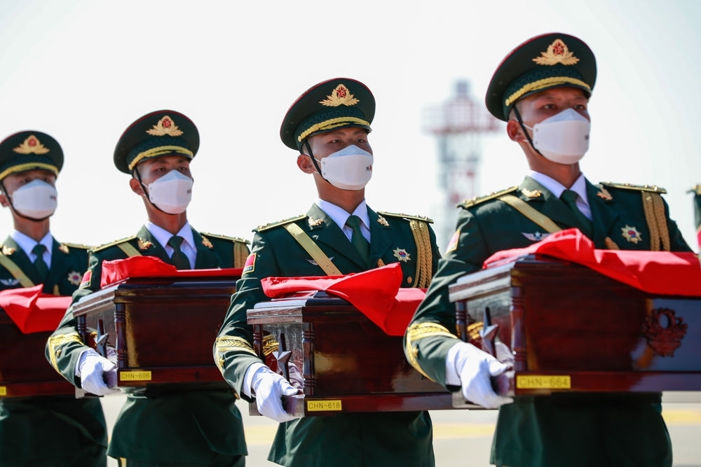 ↑9月27日,在韩国仁川国际机场,中方礼兵(左)从韩方接过中国人民志愿军烈士遗骸。