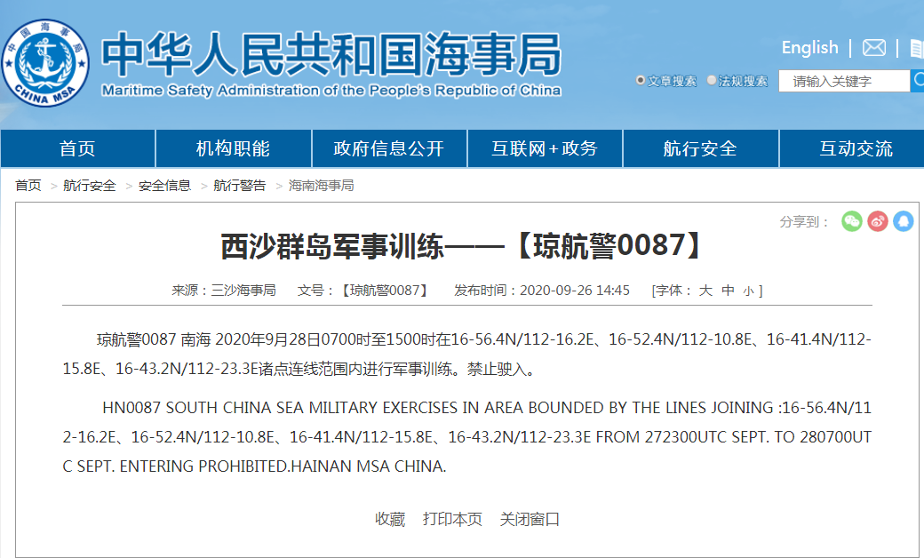 海南三沙海事局26日发布航行警告:2020年9月28日07时至15时在西沙群岛16-50.6N/112-21.0E、16-57.5N/112-21.6E、16-56.0N/112-26.1E、16-52.1N/112-28.0E诸点连线范围内进行军事训练,禁止驶入。(总台央视记者 毛鑫 魏安)