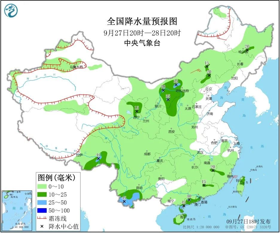 9月27日20时至28日20时,西藏东部、西北地区中东部、内蒙古大部、东北地区、华北西部、黄淮西部和北部、西南地区、江汉西部、江淮西部、江南大部、华南大部、台湾岛等地部分地区有小到中雨,其中,内蒙古河套地区、广东西南部、云南南部、西藏东南部等地局地有大雨。