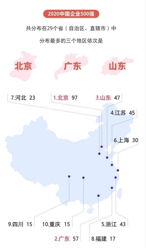 2020中国企业500强共分布在29个省(自治区、直辖市)中,分布最多的三个地区依次是北京、广东和山东。