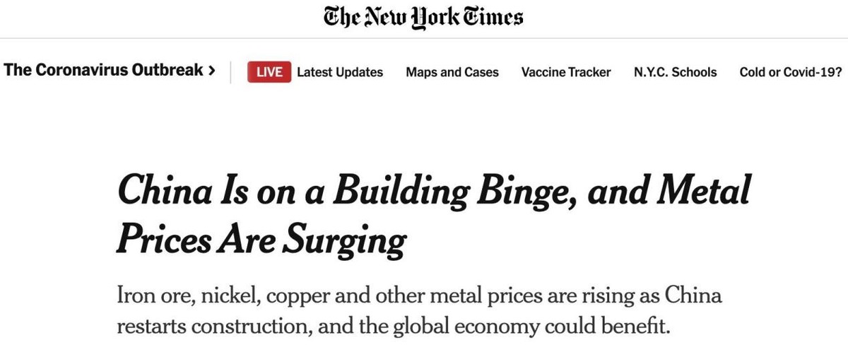 △《纽约时报》:中国正处于基建热潮中,随着中国重启建设,铁矿石、镍、铜和其他金属价格正在上涨,全球经济会因此受益。