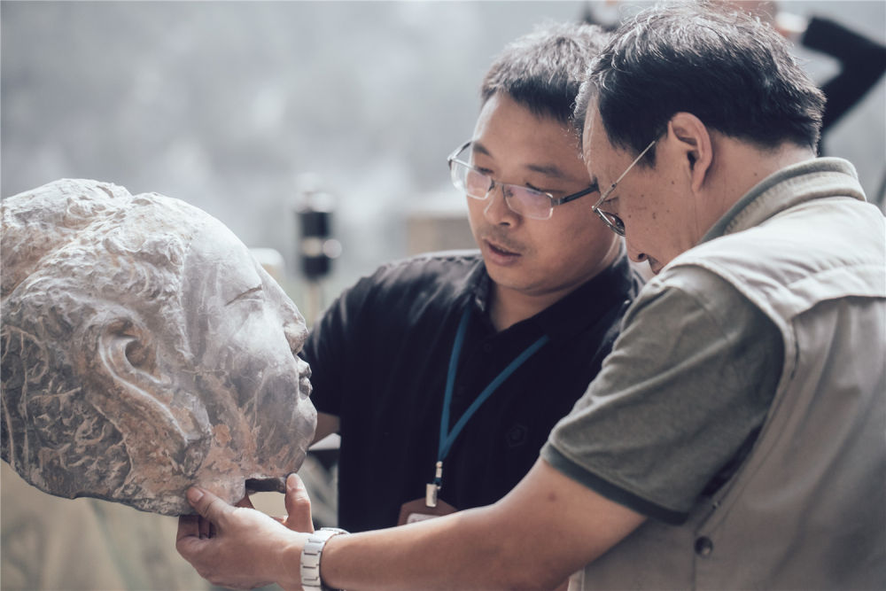 龙门石窟研究院工作人员观察3D打印“佛首”细节。