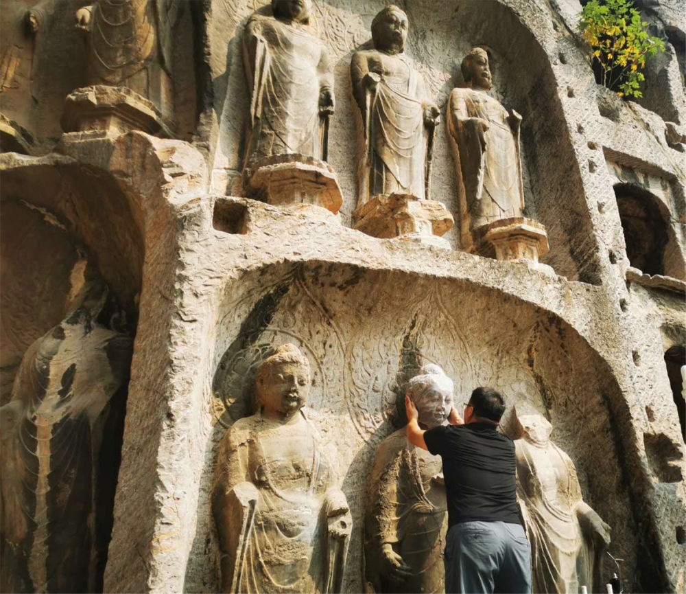 龙门石窟研究院工作人员正在安放3D打印的“佛首”。