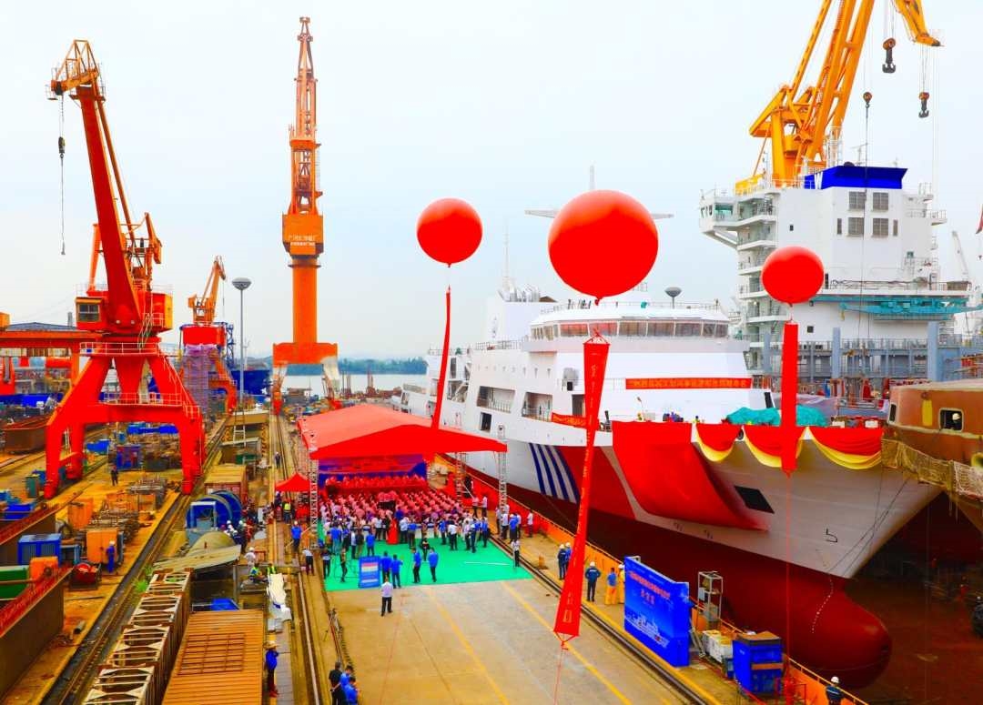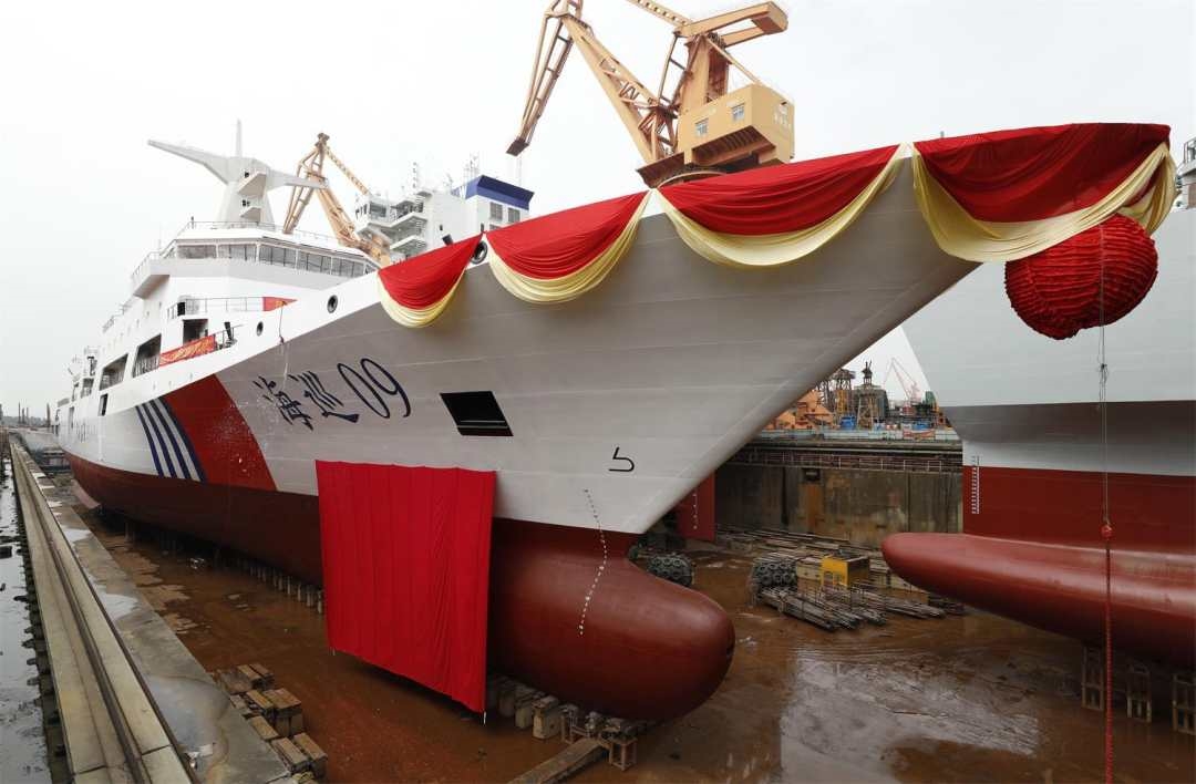 9月29日,广州黄埔文冲船厂。随着停靠在船厂周边的船舶共同鸣响汽笛,我国规模最大、装备先进、综合能力强,具有世界领先水平的万吨级海事巡逻船“海巡09”轮,成功出坞。记者在现场看到,该船外型威武、船身线条流畅,整体造型错落有致,层次感强,具有极强的视觉冲击力。