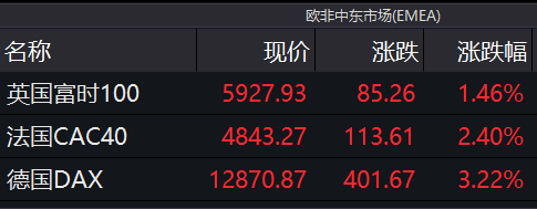 欧洲股市表现更为积极。Wind数据显示,英国富时100指数、法国CAC40指数、德国DAX指数分别上涨1.46%、2.40%、3.22%。