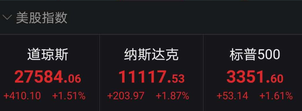 当地时间9月28日,美股三大指数全线高开。Wind数据显示,道琼斯工业指数涨1.51%,报27584.06点;纳斯达克指数涨1.87%,报11117.53点;标普500指数涨1.61%,报3351.60点。三大指数日线均实现三连阳。