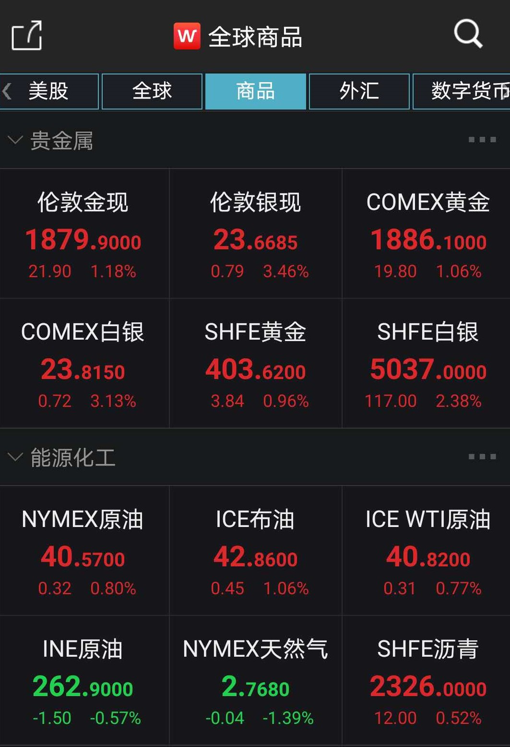 大宗商品方面,黄金、原油价格全线上涨。Wind数据显示,COMEX黄金期货涨1.06%,报1886.10美元/盎司;NYMEX原油期货涨0.80%,报每桶40.57美元。