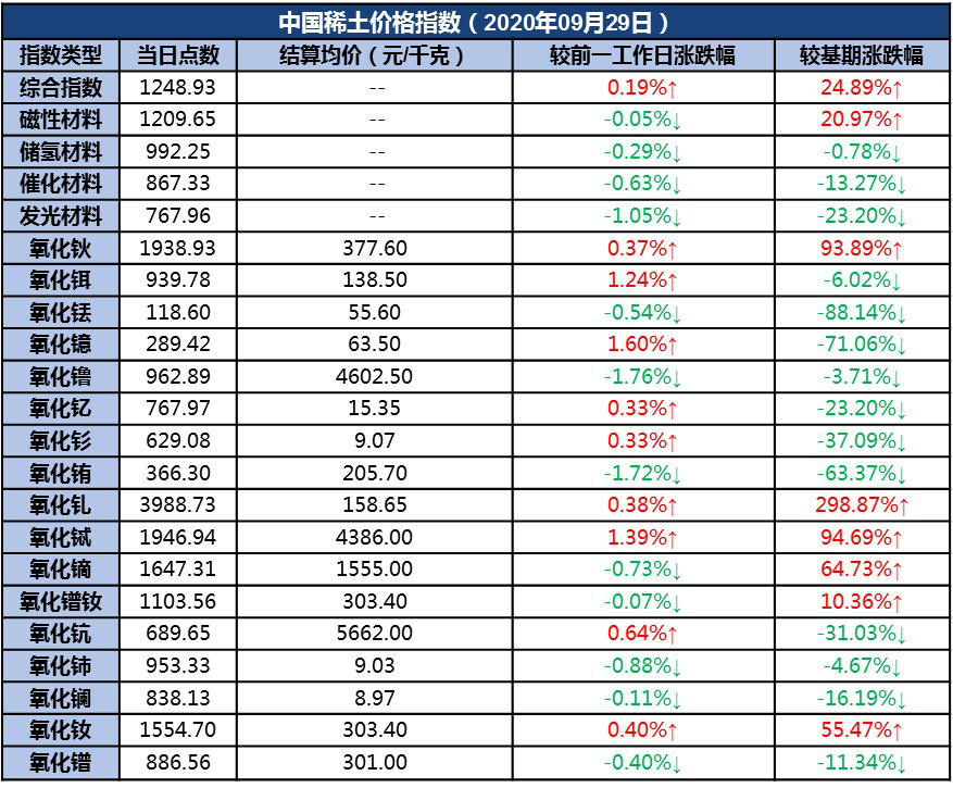 新华财经北京9月29日电(刘星麟)29日,中国稀土价格指数报1248.93点,较前一工作日上涨2.37点,涨幅为0.19%。节前稀土价格持稳为主,钕铁硼企业暂不考虑补货,市场整体成交量少,交易不集中。