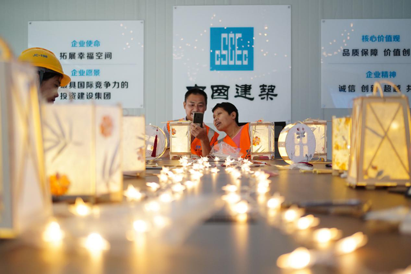9月29日,在中建三局苏州狮山广场项目上,职工和工友以做花灯的形式,托物寄情,话续乡情,感受传统节日氛围。期间,不少工友纷纷拿起手机和家人通起了电话。“嫂子,过的好不好啊?快看!我们在做手工灯笼呢!”祝国伢、陈艳娥和自己远在湖北孝感的亲人通话时说。