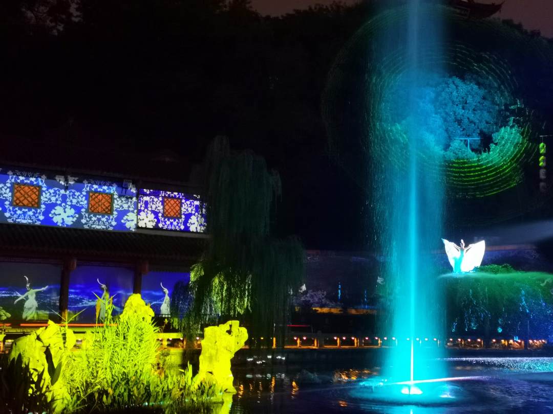 在鹅池,项目主办方通过动画、音乐、投影、激光、雾森等手段,将夜间黄鹤楼公园的山体、池水、楼阁、亭台、长廊活化。同时,融入真人实景演艺,再现蛇山上辛氏酒楼的喧闹,讲述一个道士报恩,画鹤起舞的故事。