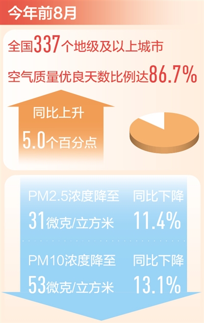 生态环境部公布的数据显示,今年前8月,全国337个地级及以上城市空气质量平均优良天数比例达86.7%,同比上升5.0个百分点,PM2.5、PM10浓度分别降至31微克/立方米、53微克/立方米,同比下降11.4%、13.1%。