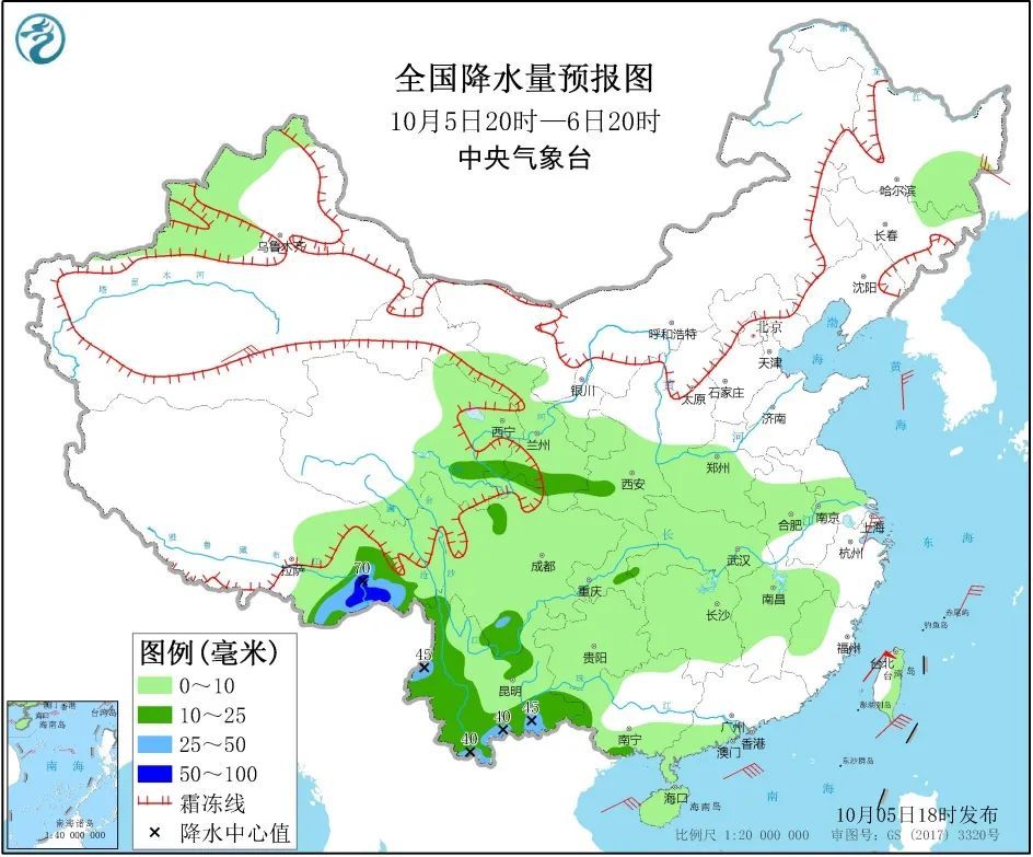 10月5日20时至6日20时,西藏东南部、甘肃东南部、云南西部和南部等地部分地区有中到大雨,其中,西藏东南部等地部分地区有暴雨(50~70毫米)。