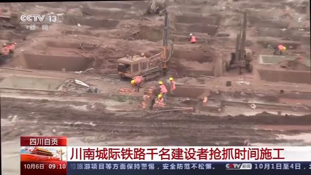 国庆中秋假期,川南城际铁路自贡东站施工现场的建设者们放弃假日休息时间,确保保质保量按时完成建设任务。
