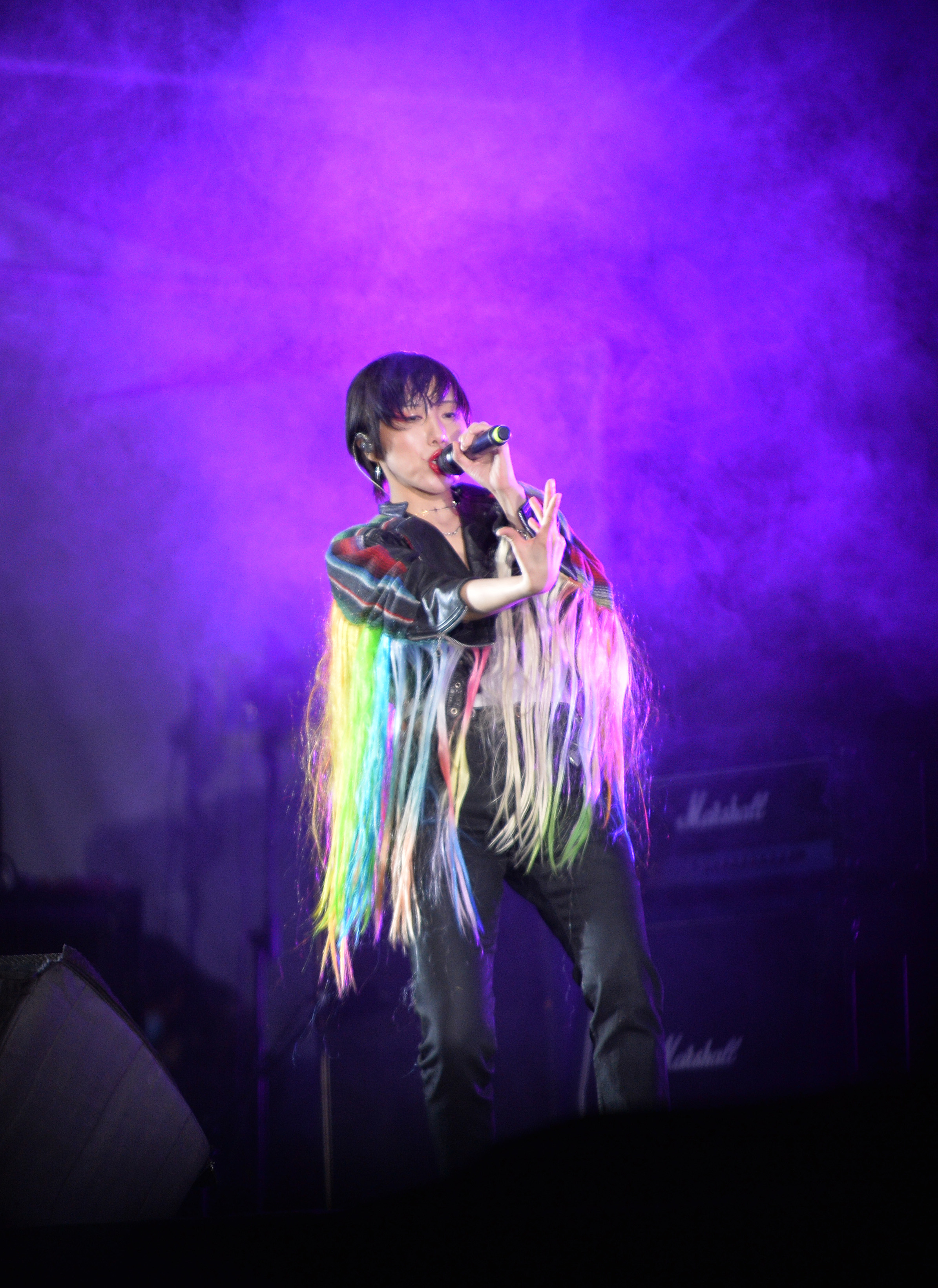 ↑10月5日,后海大鲨鱼乐队主唱付菡在草莓音乐节的爱舞台表演。