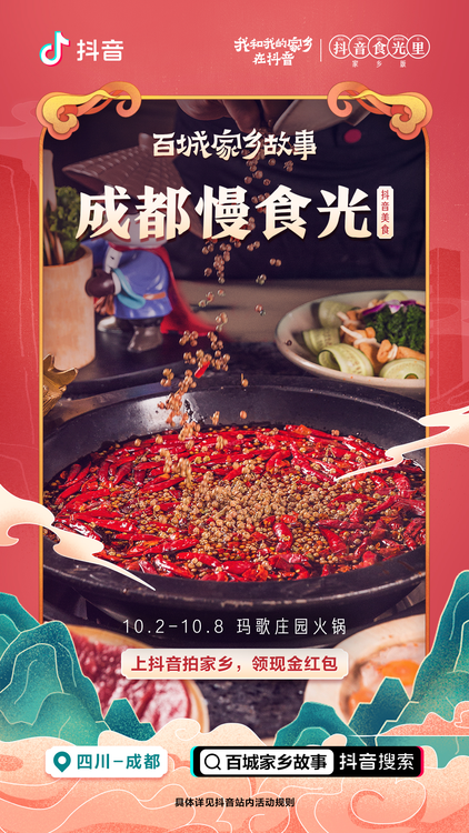 10月2日至10月6日,“抖音百城家乡故事”四川区域持续开播,以成都慢时光、四川武术、国宝熊猫等多纬度展现四川特有的人文情怀与独特风景。国庆期间,抖音家乡食光里以“成都慢食光”为主题,将一场草莓音乐节火锅访谈直播、一次锦江夜游、一场NUART艺术节、一夜玛歌庄园火锅音乐节,用一辆抖音“漫游巴士”织成了一张记录成都的“慢生活地图”。在打造极具成都特色的线下沉浸式场景的同时,以直播的形式将成都的生活气和烟火气带到线上。