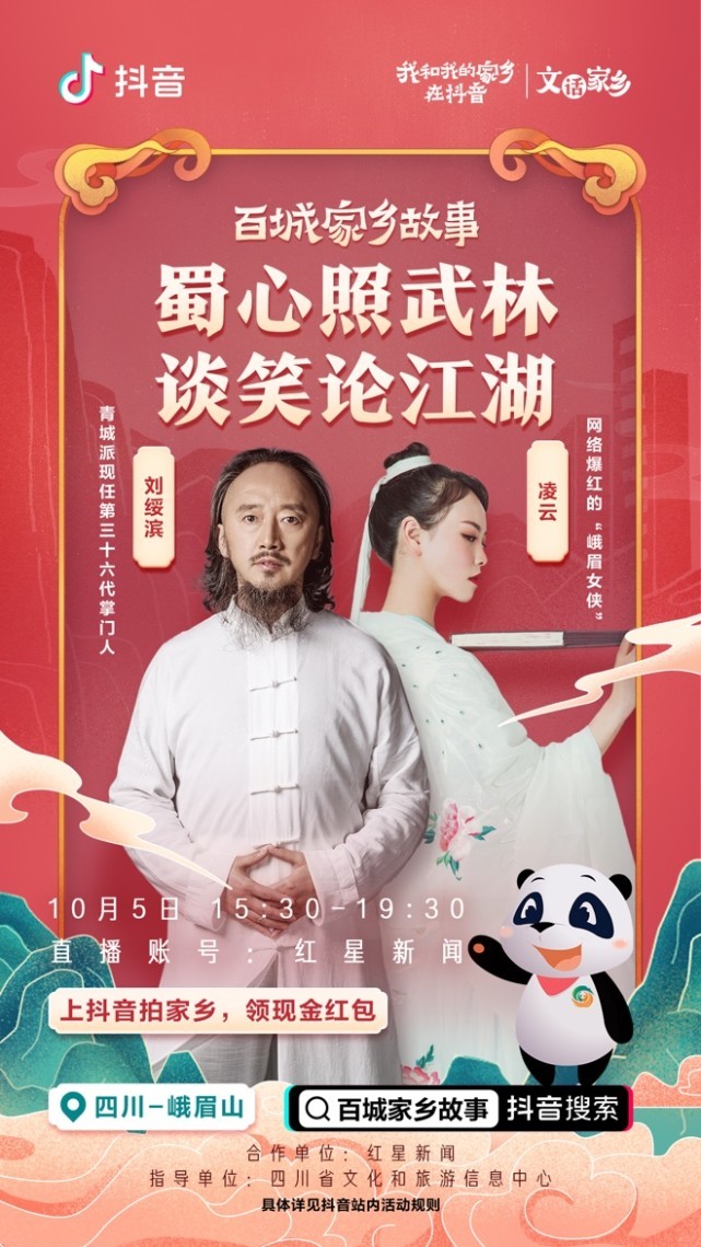 此次抖音百城家乡故事邀请到唯一国家级峨眉武术传承人王超和青城派武术传承人刘绥滨进行对话,交流习武经历,分享背后的家乡情怀。整场直播持续四小时,累计21w人在线观看。