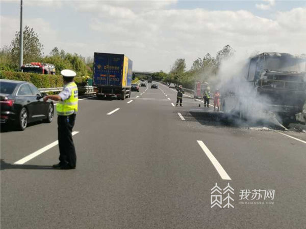上午10时51分许,南京交警高速四大队指挥室民警通过道路视频监控巡查发现在绕城高速东北段北向南进城方向,有一辆大客车尾部有明火,并伴有浓浓黑烟冒出,随后该车停靠在第三车道和应急车道之间。见此情况,高速四大队立即启动应急处置预案,通知大队附近警力及在队民警赶往现场处置,同时联系消防等单位。与此同时,大队指挥室接到该车驾驶人徐某的报警求助,在沟通中,民警要求徐某先将全部乘客疏散至安全区域。
