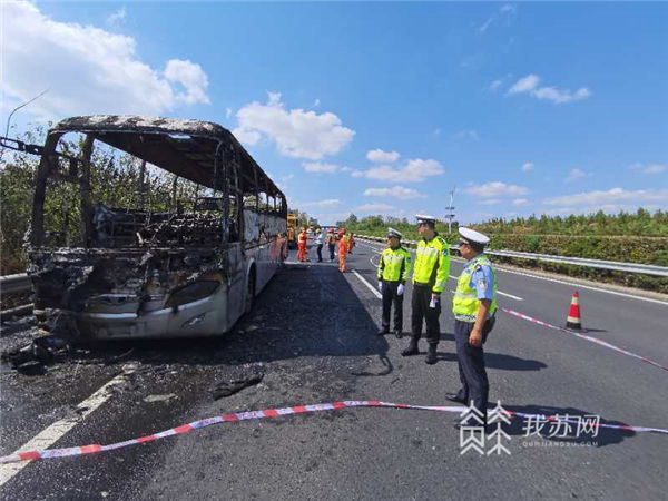 民警到达现场后,一方面立即在自燃客车后方做好防护措施,视现场情况采取管控措施,为消防救援车辆提供有利条件;另一方面将已经从车上撤离下来的乘客疏散至安全区域,并联系接驳车辆将乘客转运至目的地。之后,现场民警协助消防人员合力将自燃车辆明火扑灭,但此时客车已被基本烧毁。