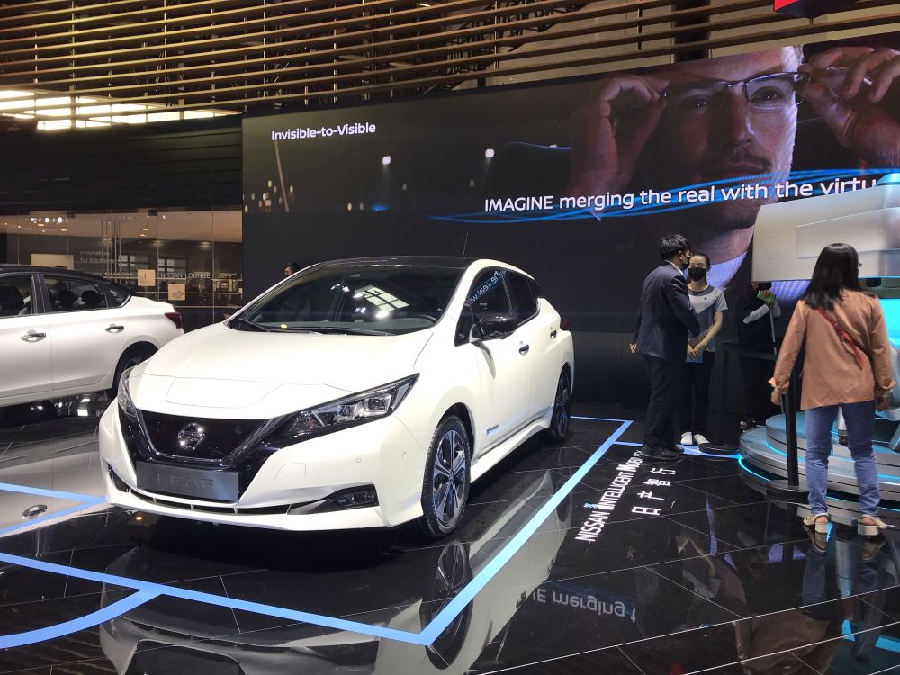 图为在2020(第十六届)北京国际汽车展览会上,日本日产汽车展台“日产智行(NissanIntelligentMobility)”体验区内展出的世界上首款纯电动汽车日产LEAF。周武英摄