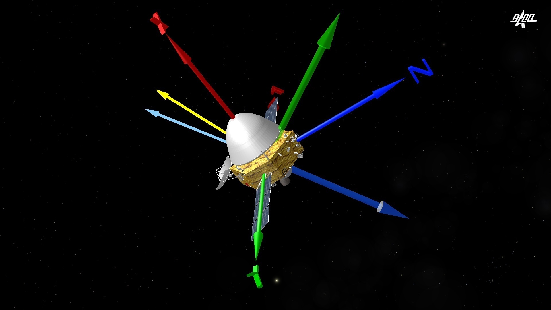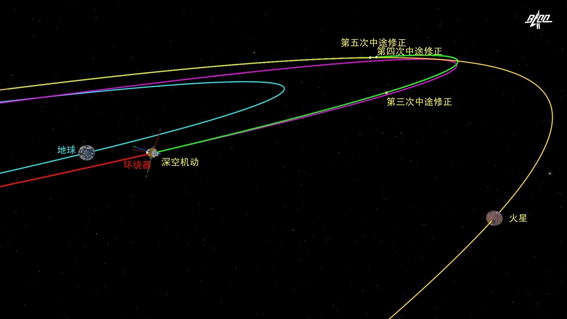 为了减小飞行偏差,使探测器沿着预定的轨道飞行而进行的轨道控制称作修正。改变探测器当前轨道,使其进入一条新的轨道而进行的轨道控制称作机动。此次轨道机动在距离地球大约 2940 万千米的深空实施。天问一号的轨道设计,综合考虑了从发射到火星捕获的各种约束条件并使推进剂消耗尽可能小,采取了转移过程中进行一次深空机动的策略。
