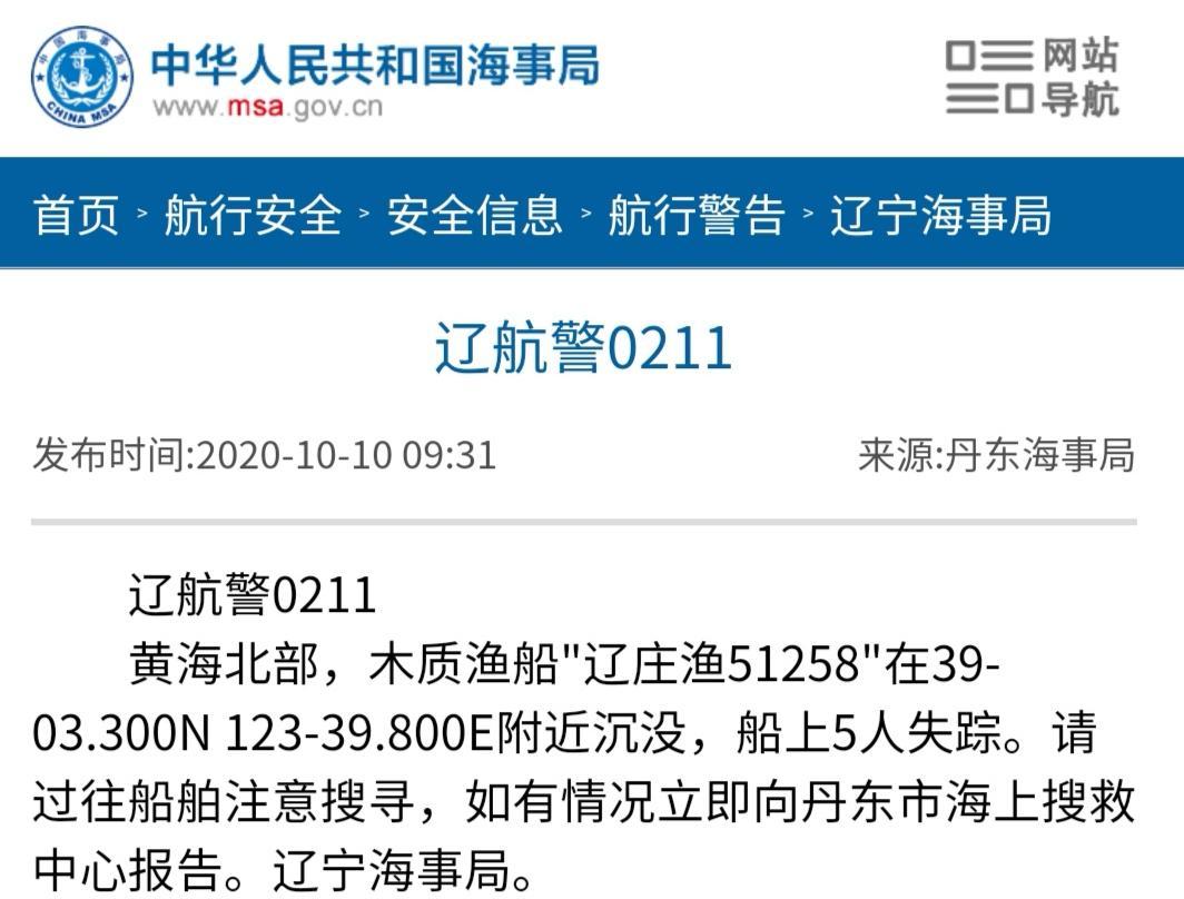 据中国海事局官网消息,10月10日,丹东海事局发布辽航警0211:黄海北部,木质渔船“辽庄渔51258”在39-03.300N 123-39.800E附近沉没,船上5人失踪。请过往船舶注意搜寻,如有情况立即向丹东市海上搜救中心报告。
