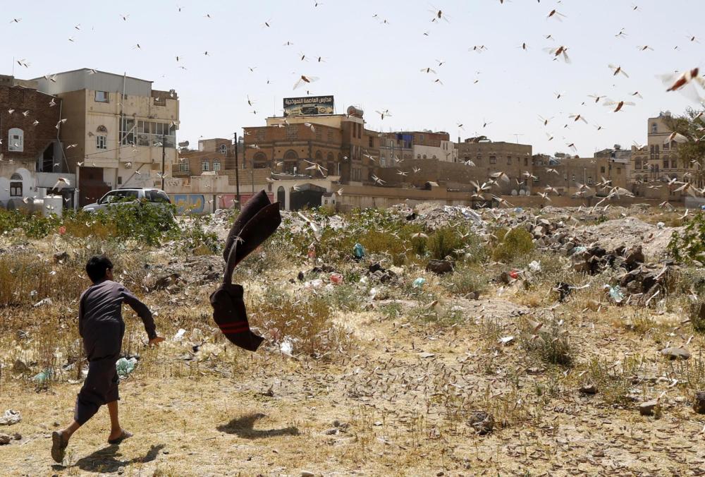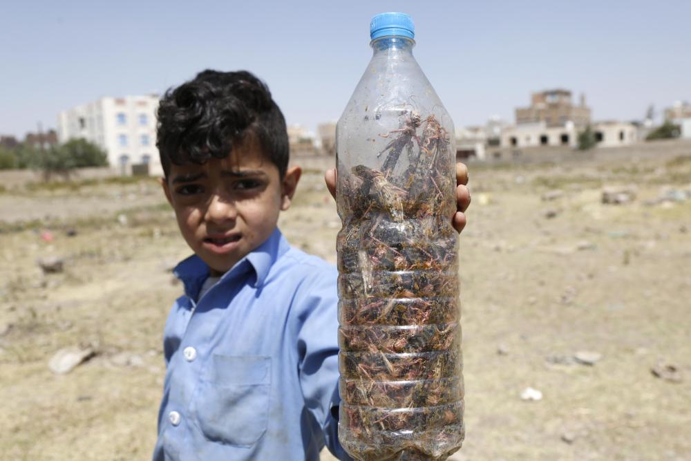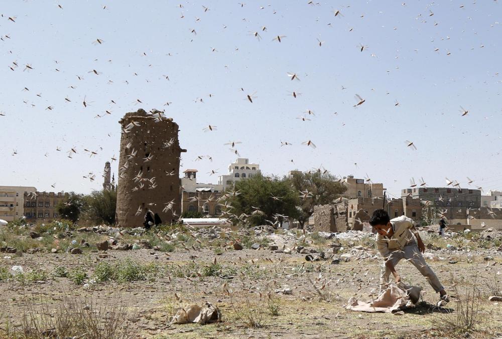↕10月9日,一名男孩在也门首都萨那捕捉蝗虫。