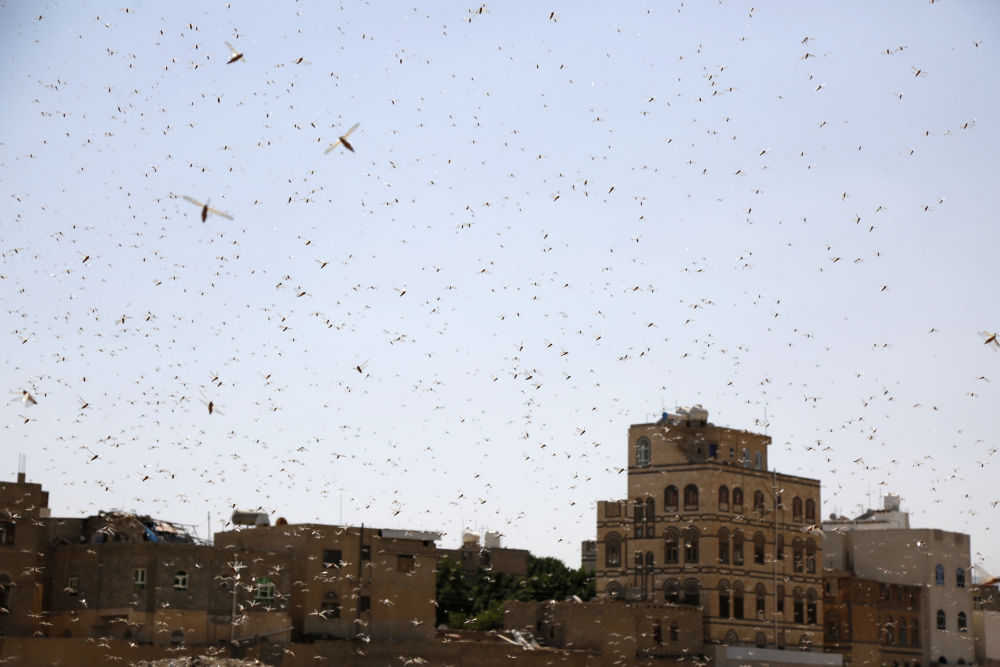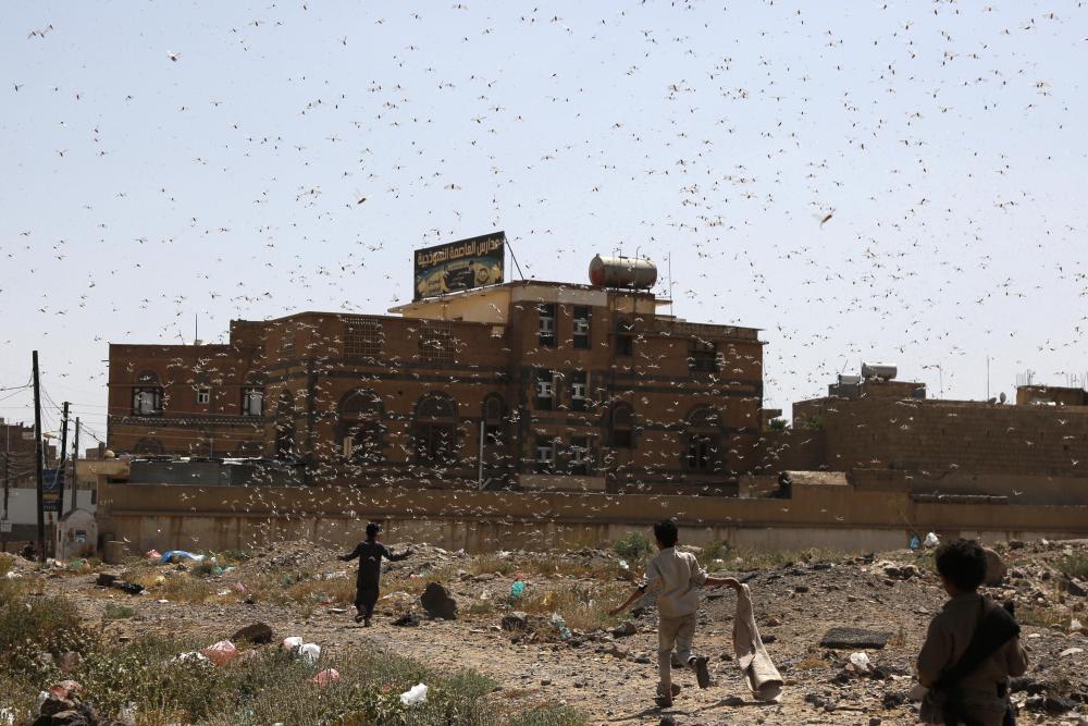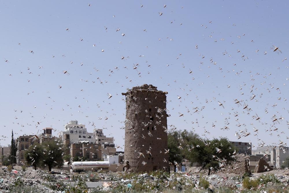 ↕10月9日,蝗虫从也门首都萨那空中飞过。