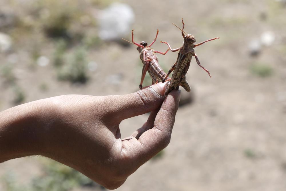 ↕10月9日,一名男孩展示捉到的蝗虫。