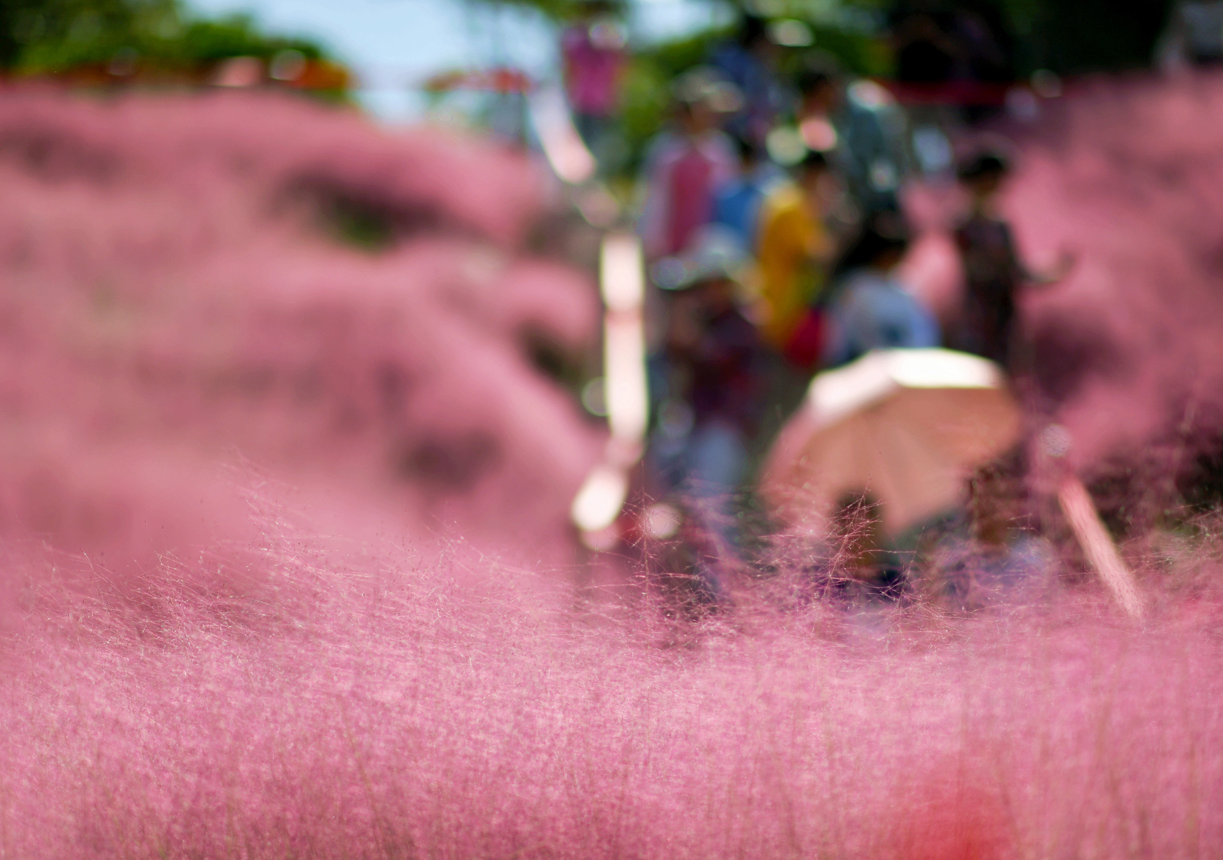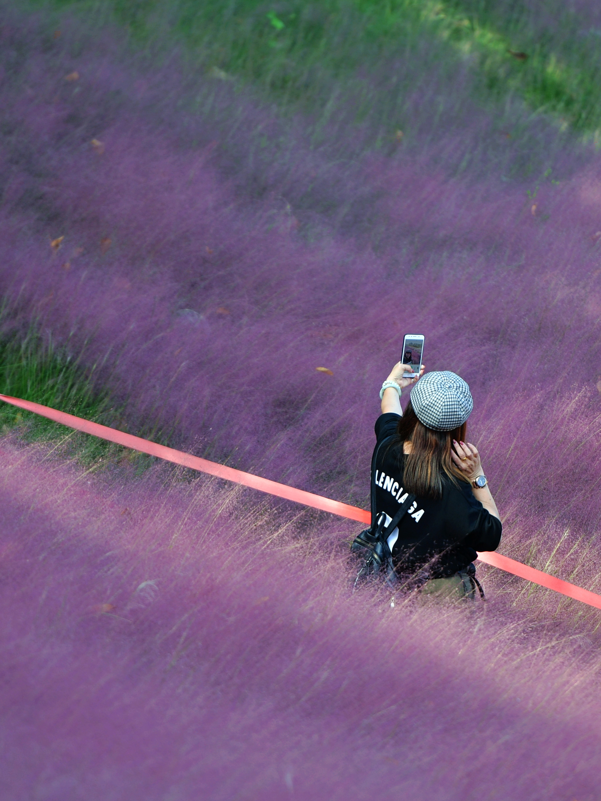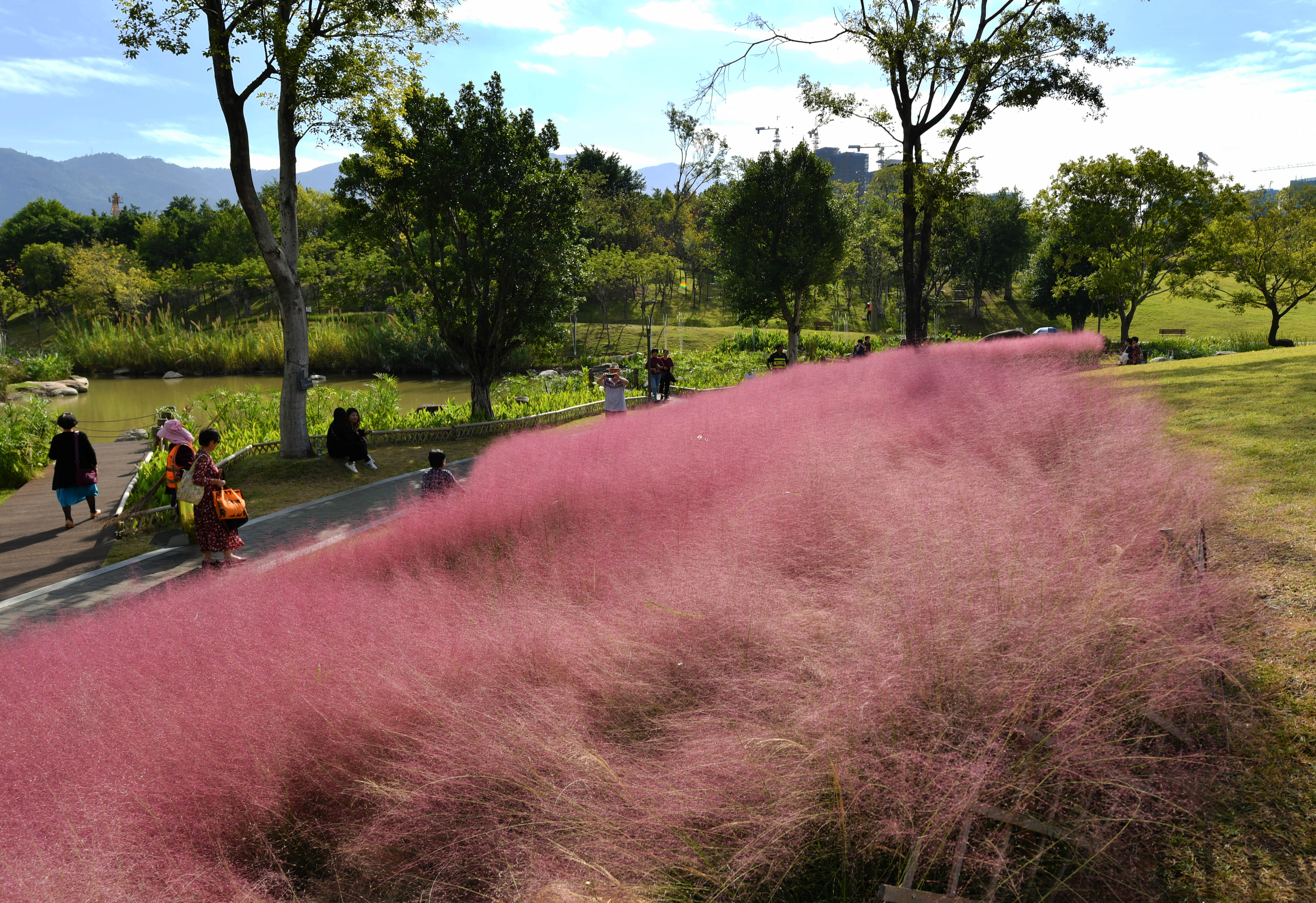 金秋时节,福建省福州市牛岗山公园和鹤林生态公园里的粉黛乱子草进入观赏季,成片的“粉色海洋”如梦幻花海,吸引游客和摄影爱好者前来观赏拍摄。