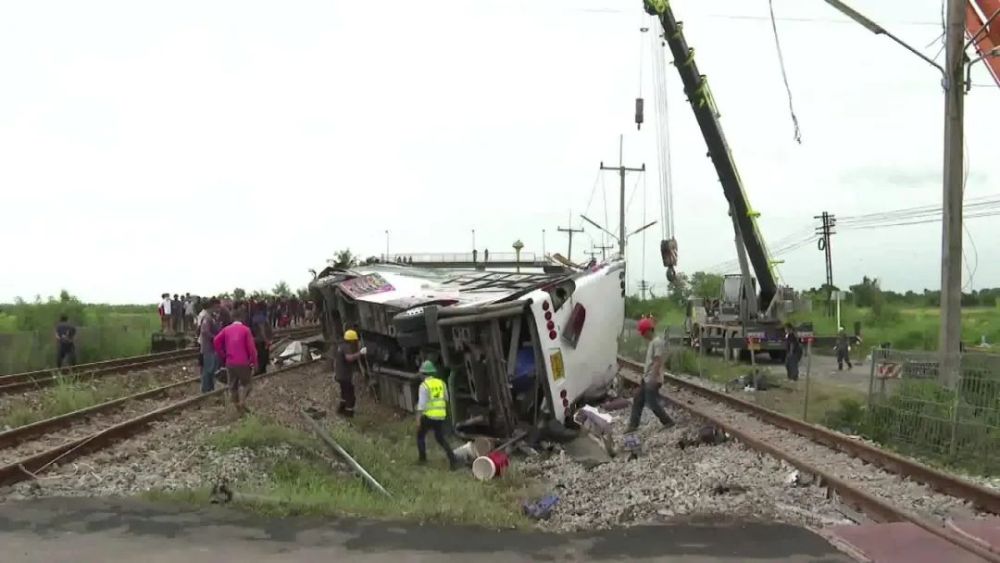 泰国中部北柳府10月11日发生一起火车与巴士相撞事故,造成至少20人死亡。