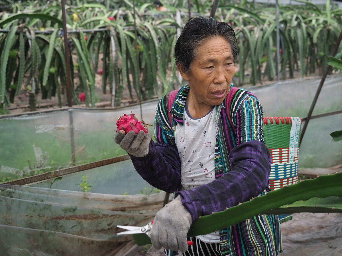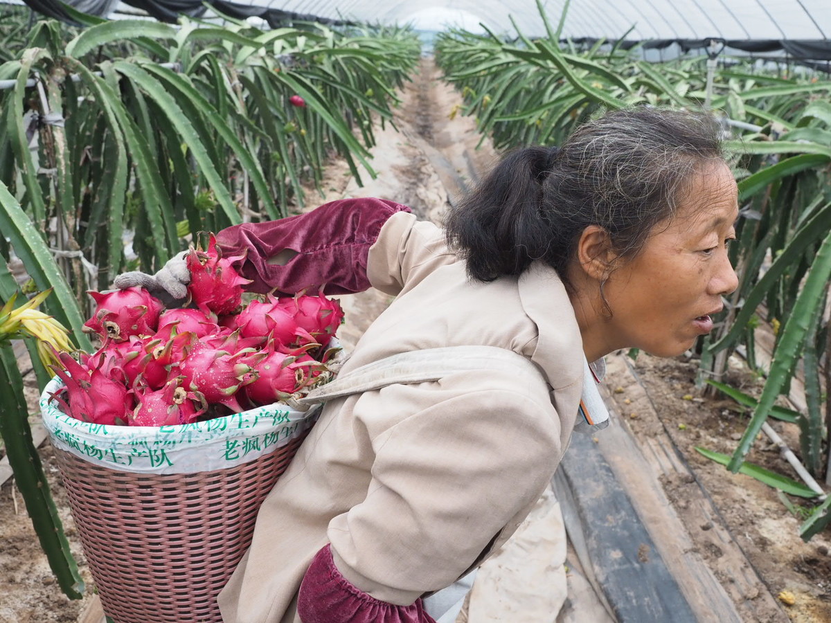 近些日子,当地阴雨连连。这本不是采摘果实的最佳天气,但李义洋的种植基地却是一片繁忙景象。随着清脆的“咔嚓”声,几个四五十岁的农村妇女熟练地剪下桃红色、拳头大的有机火龙果,反手放入背篓。