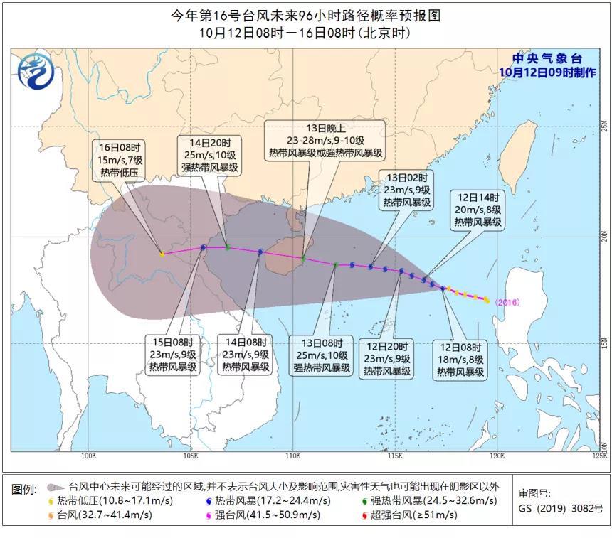 海南省气象局10月12日9时30分继续发布台风四级预警。据监测,南海热带低压已于12日8时加强为今年第16号台风(热带风暴级),中心位于北纬17.6度,东经117.3度,也就是距离海南省万宁市偏东方向约740公里的南海中部海面上,中心附近最大风力为8级(18米/秒)。
