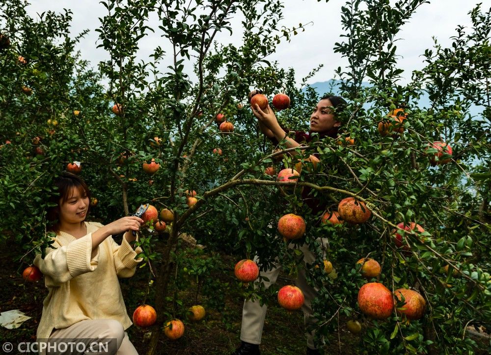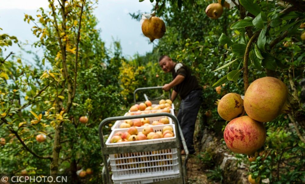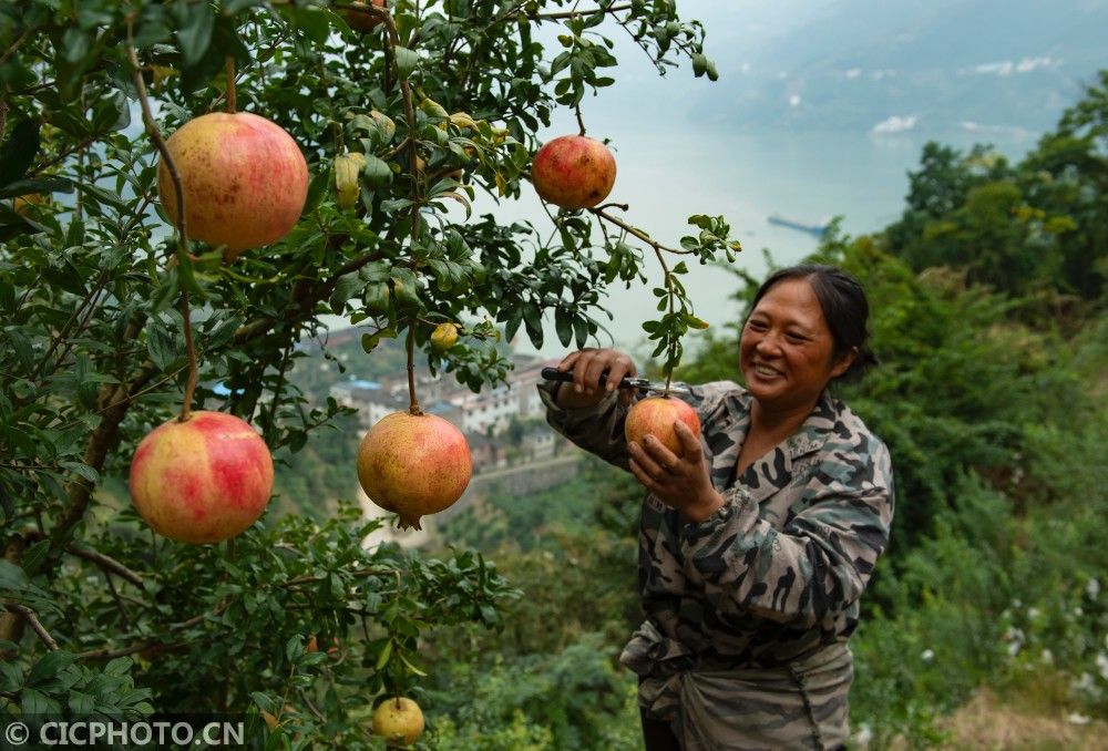 ↑2020年10月11日,湖北省秭归县屈原镇长江村石榴种植户在田间采摘石榴。CICPHOTO/郑家裕 摄