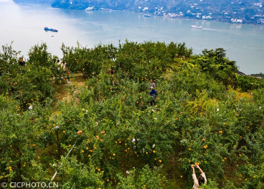 ↑2020年10月11日,游客和当地村民在湖北省秭归县屈原镇长江村石榴种植园里采摘石榴(无人机照片)。CICPHOTO/郑家裕 摄
