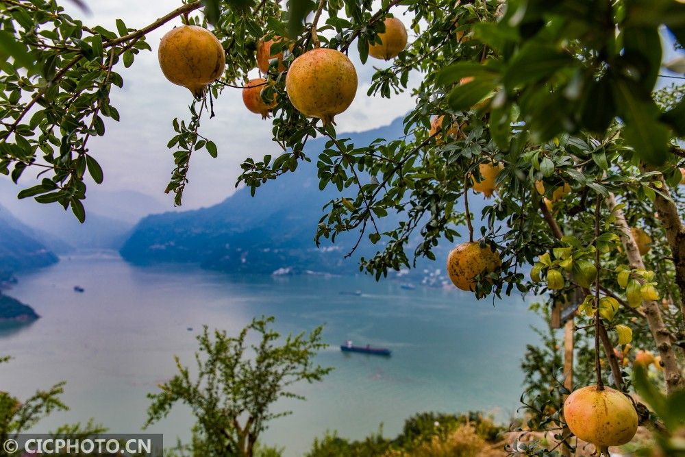 ↑2020年10月11日,在湖北省秭归县屈原镇长江村石榴种植园,远处的货轮从结满果实的石榴园前开过。CICPHOTO/梅雪飞 摄