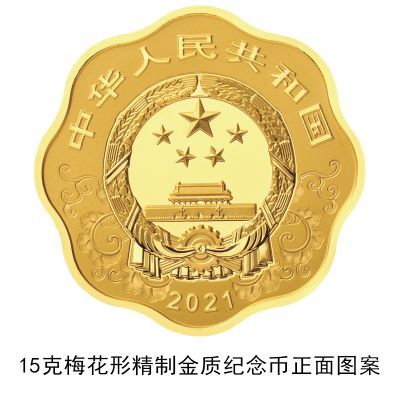 (七)15克梅花形金质纪念币为精制币,含纯金15克,外接圆直径27毫米,面额200元,成色99.9%,最大发行量6000枚。