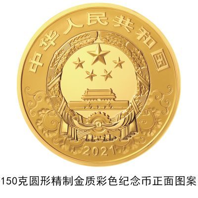 (六)150克圆形金质彩色纪念币为精制币,含纯金150克,直径60毫米,面额2000元,成色99.9%,最大发行量1000枚。