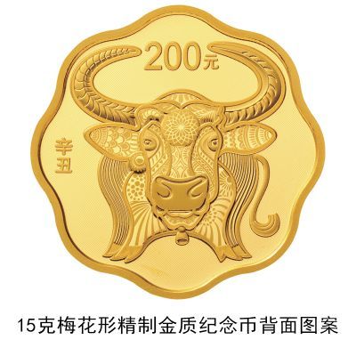 15克梅花形金质纪念币背面图案为装饰牛造型。