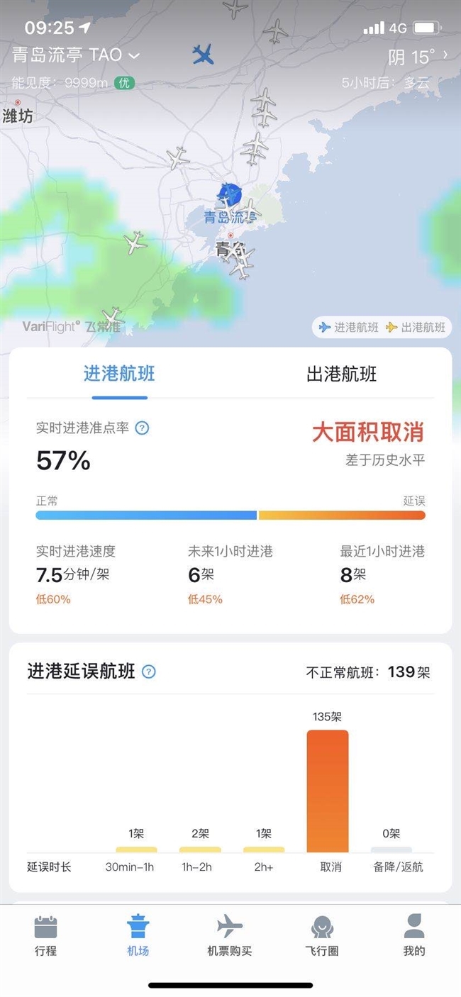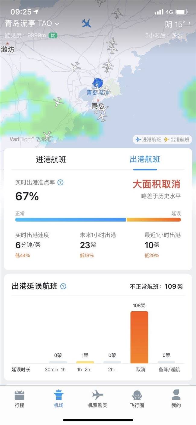 据飞常准APP最新数据显示,截至9时25分,青岛流亭机场已取消进出港航班243架次(含提前取消),航班取消占比49.79%。