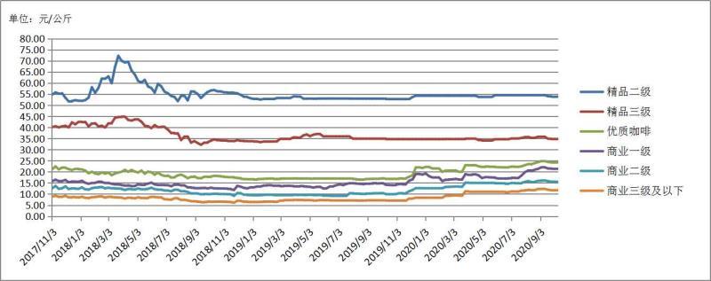 具体来看,精品二级咖啡豆均价报53.75元/公斤,较上期下跌0.10元/公斤,跌幅0.19%;精品三级咖啡豆均价报34.56元/公斤,较上期下跌0.22元/公斤,跌幅0.63%;优质咖啡豆均价报24.12元/公斤,较上期下跌0.10元/公斤,跌幅0.41%;商业一级咖啡豆均价报21.24元/公斤,较上期下跌0.11元/公斤,跌幅0.52%;商业二级咖啡豆均价报15.43元/公斤,较上期下跌0.11元/公斤,跌幅0.71%;商业三级及以下咖啡豆均价报11.64元/公斤,较上期下跌0.05元/公斤,跌幅0.43%。