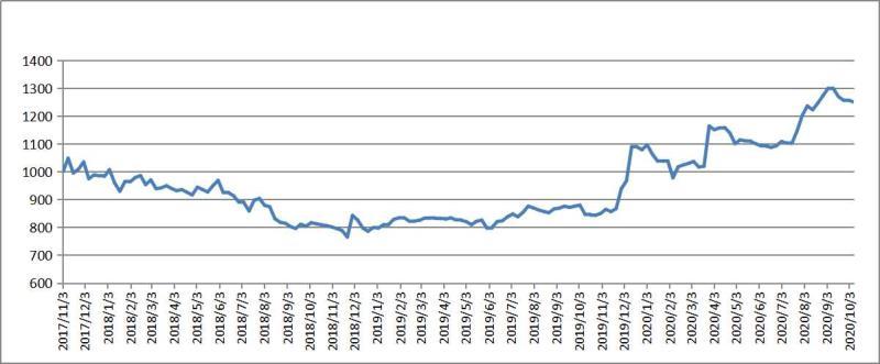 10月9日,指数报1250.26点,较上期(2020.9.21-9.27,下同)下跌6.37点,跌幅0.51%,与基期相比上涨250.26点,涨幅25.03%。