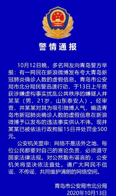 记者从青岛市公安局市北分局获悉,10月12日晚,多名网友向青岛警方举报:有一网民在微博发布夸大青岛新冠肺炎确诊人数的虚假信息。13日,该嫌疑人井某某(男,21岁,山东泰安人)被查获。