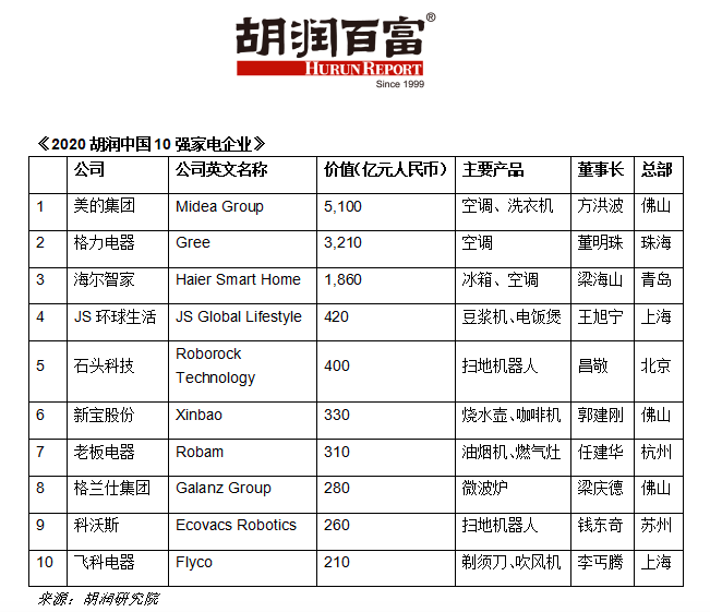 10月14日,胡润百富官方公众号发布《2020胡润中国10强家电企业》报告。