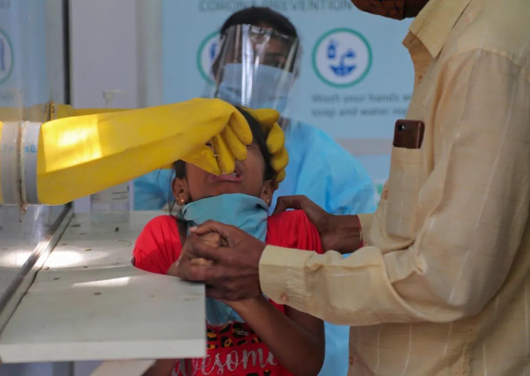 10月3日,在印度海得拉巴一处新冠病毒检测中心,一名男子帮助医务人员为一名孩子进行检测。新华社/美联