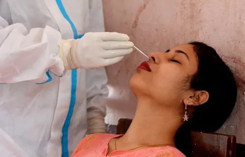 9月28日,在印度高哈蒂,医护人员为一名女子进行新冠病毒检测采样。新华社发