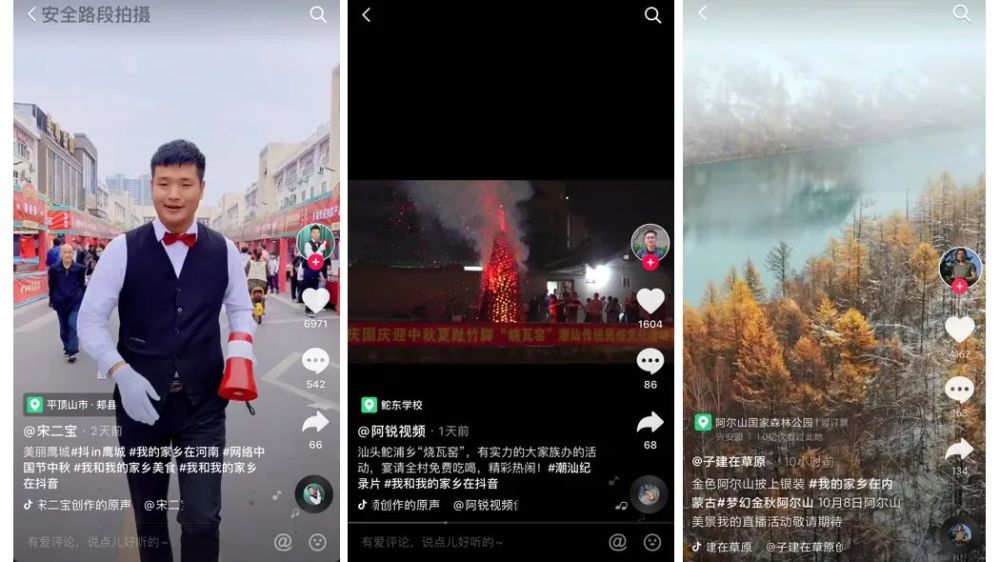 据了解,此次“我和我的家乡在抖音”主题活动中,抖音话题#我和我的家乡总播放量超过31亿。来自河南平顶山的小伙@宋二宝用说唱的形式讲述家乡美食美景,郏县豆腐菜、饸络面、宝丰羊汤面......地道美食如数家珍,引发许多河南同乡人的共鸣;广东汕头用户@阿锐视频在汕头鮀浦乡记录“烧瓦窑”的全过程,让更多人感受到潮汕地区的传统民俗活动;@子建在草原在全国纬度最高的城市之一——阿尔山市,拍下金秋之际早已披上银装的阿尔山。